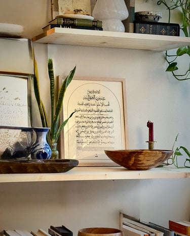 Our modern rendition of this prayer, presented through classical Arabic calligraphy in a contemporary monochromatic screen print, serves as a bridge between past and present. It invites us to rediscover the depth and significance that intentionality can bring to our daily routines.